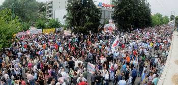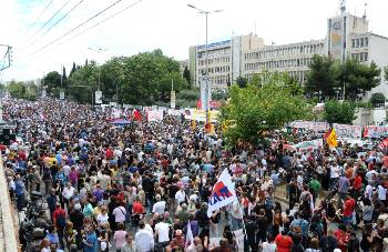 Σε μια μεγάλη πολύωρη διαδήλωση, έξω από το ραδιομέγαρο της ΕΡΤ, εξελίχθηκε η απεργιακή συγκέντρωση του ΠΑΜΕ την περασμένη Πέμπτη στην πλατεία της Αγ. Παρασκευής. Ηδη από τις 10 το πρωί χιλιάδες εργαζόμενοι και αυτοαπασχολούμενοι, άνεργοι και φοιτητές, γυναίκες και άνδρες κάθε ηλικίας άρχισαν να κατακλύζουν την πλατεία. Με τις σημαίες του ΠΑΜΕ, της ΟΓΕ, του ΜΑΣ, της ΠΑΣΕΒΕ, με τα πανό των συνδικάτων της Αθήνας, τα τραγούδια και τα συνθήματά τους «έριξαν μαύρο» στην αντιλαϊκή πολιτική. Το σύνθημα στην πλάτη της εξέδρας