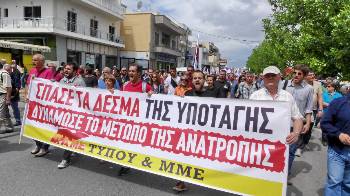 Μετά το τέλος της συγκέντρωσης, ποτάμι φουσκωμένο η διαδήλωση ανέβηκε από την πλατεία προς το ραδιομέγαρο της ΕΡΤ όπου μέσα βρίσκονταν εκατοντάδες εργαζόμενοι, καταλαμβάνοντας και τις δύο κατευθύνσεις της λεωφόρου Μεσογείων. Οταν η κεφαλή της πορείας που κινούνταν σε πυκνά μπλοκ έφτασε στο τέλος της περίφραξης του ραδιομεγάρου της ΕΡΤ, τα τελευταία μπλοκ έπιαναν θέση στη λεωφόρο στο ύψος της εκκλησίας της Αγ. Παρασκευής. Επικεφαλής της διαδήλωσης το μπλοκ του ΠΑΜΕ Τύπου και ΜΜΕ με το σύνθημα στο πανό του να προτρέπει: «Σπάσε τα δεσμά της υποταγής, δυνάμωσε το μέτωπο της ανατροπής».